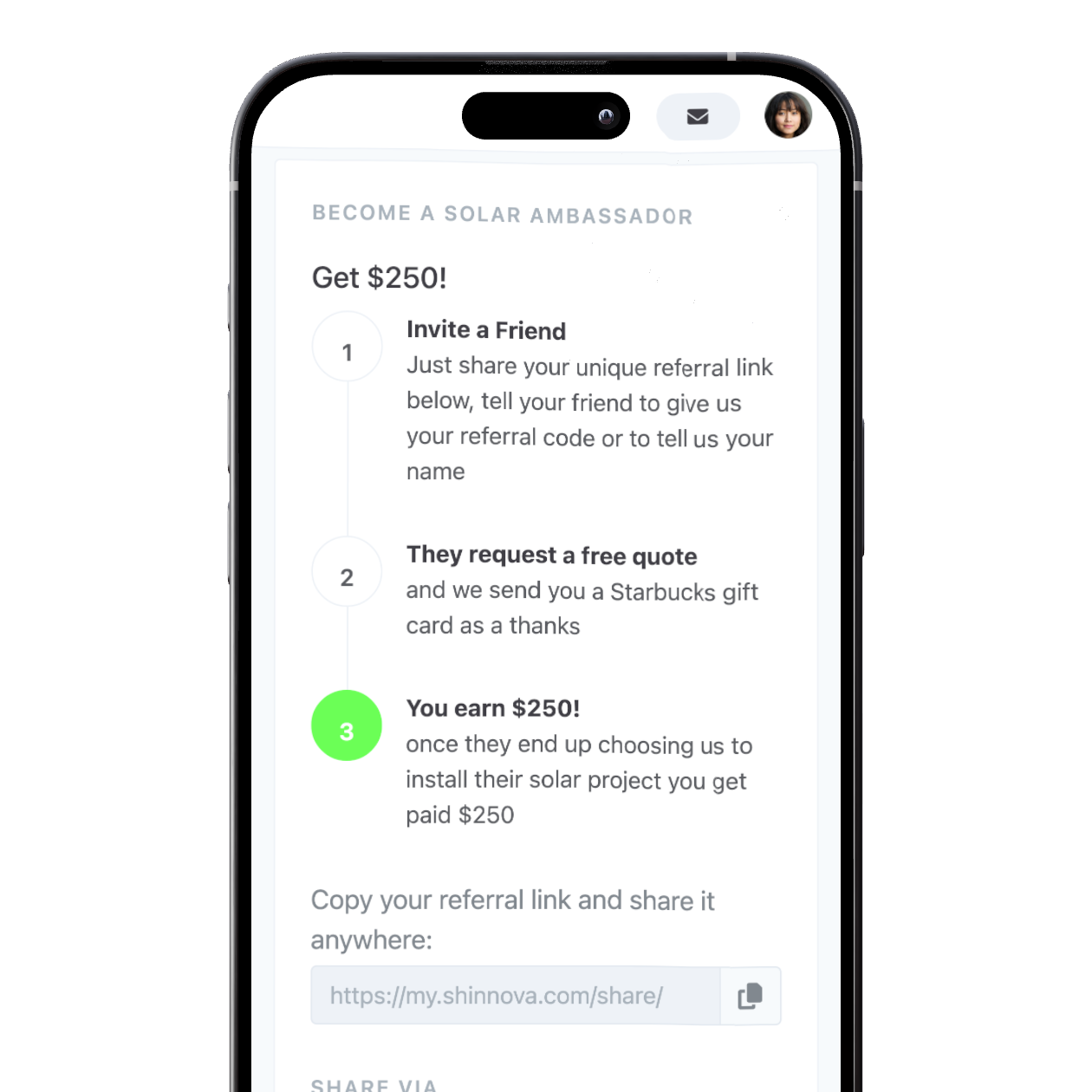 Have you been happy with Shinnova Solar? Refer a friend or family member conveniently by sending their contact info through the app or sharing your personalised referral page with them and earn money as a thank you.